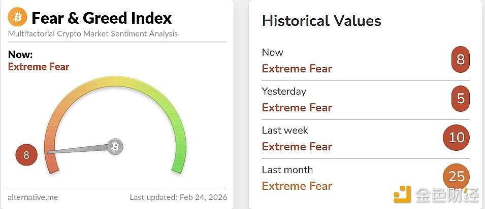 金色财经报道,据alternative.me数据显示,加密货币恐慌贪婪指数当前为8,处于极度恐慌状态。加密KOL陈剑Jaso称,昨日恐慌贪婪指数为5,创历史最低纪录。在此之前新冠疫情期间最低到8,Terra崩盘最低到6,FTX暴雷最低到6。