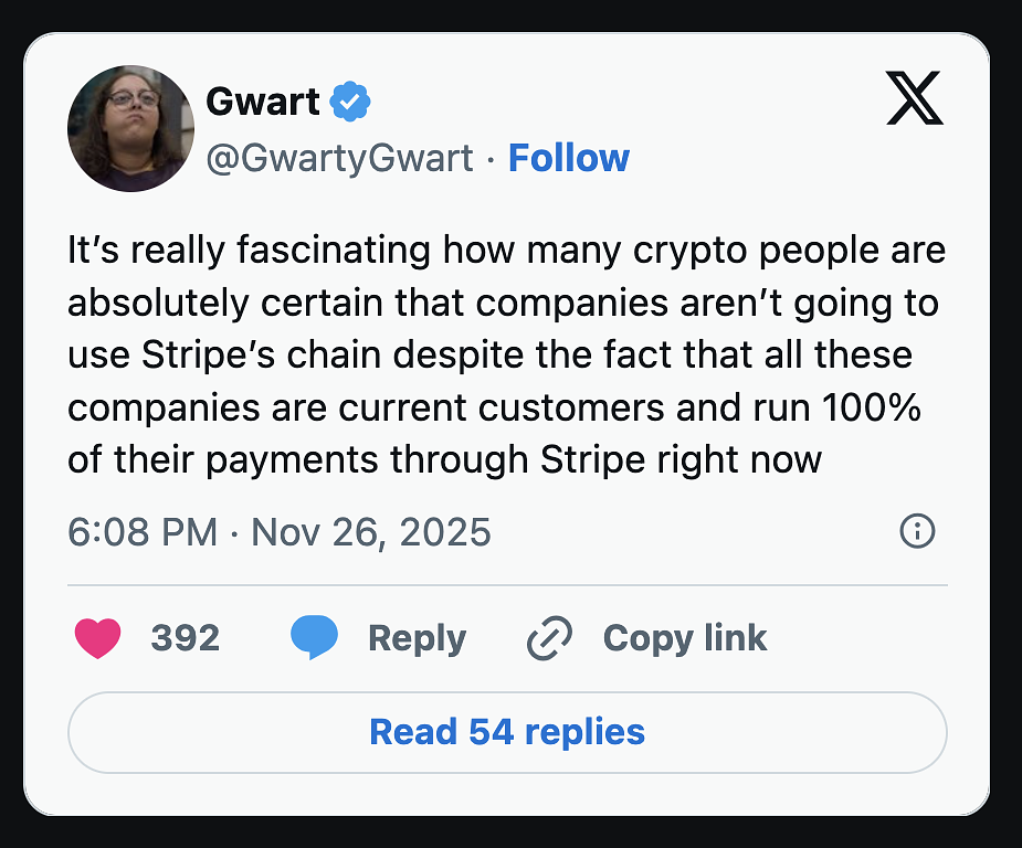 Plasma 是今年早些时候上线的首个稳定币链。虽然关于其 XPL 代币价格表现有很多值得称道,但可以说他们创造了一个基础设施类别,n 条链认为值得为此努力。也就是说,如果这完全无关紧要,我们就不会看到企业跳出来推出自己的稳定币链。不过我们马上会说到这个。