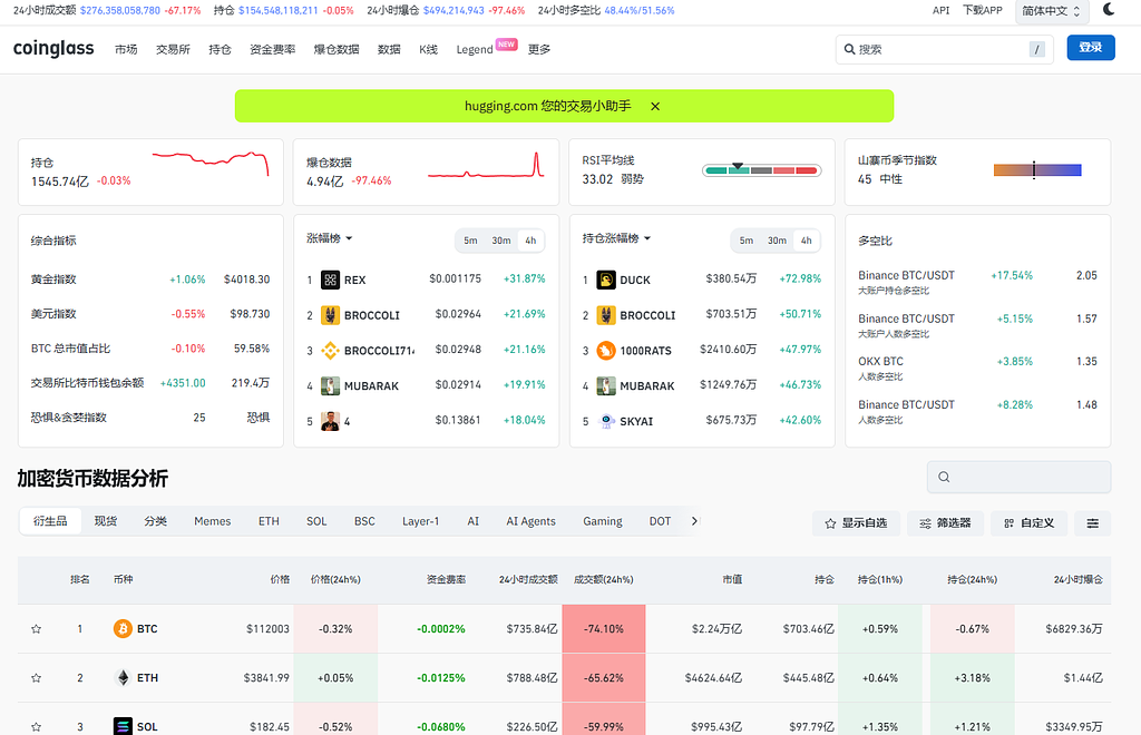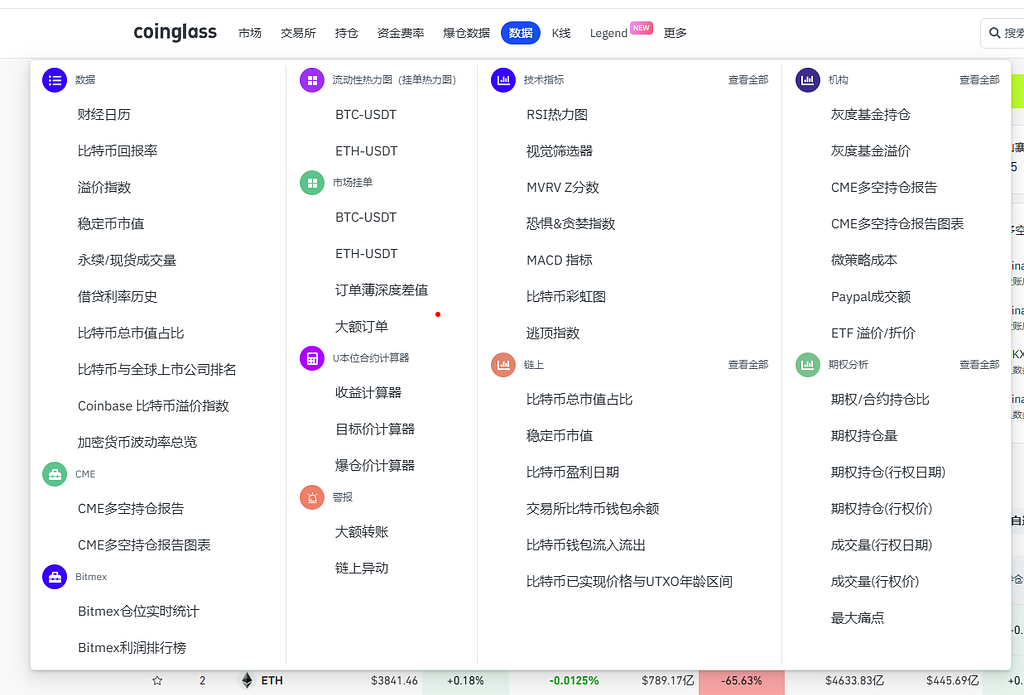 Coinglass主要提供实时和历史的期货/合约市场数据,未平仓合约、资金费率、爆仓等指标。