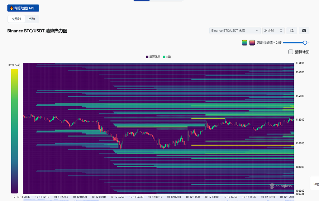 可视化的爆仓热图显示在某些价格区间可能出现大量爆仓点,帮助用户洞察潜在波动点。
