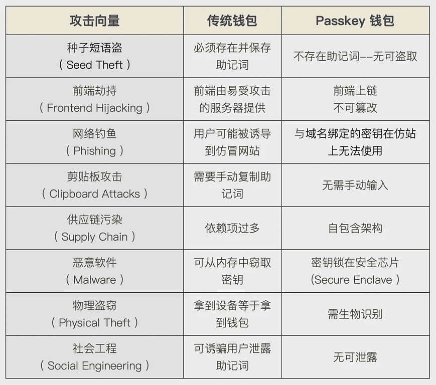 免疫矩阵 技术原理 这种免疫性源于根本的架构差异: Passkey 无法被提取或复制,私钥在安全芯片中生成和永久绑定,没有函数可以提取,没有 API 可以读取它,即使获得设备的最高权限(Root Access)也无法访问。 生物验证在本地完成,面部或指纹数据永远不会离开用户的设备,安全芯片验证用户生物特征,匹配后才允许密钥签署,与网络请求、外部验证和攻击面都无关。 域名绑定阻止重定向,每个 Passkey 都以加密方式绑定到特定域名,即使攻击者创建了一个完美的网站副本,该 Passkey 也根本无法在那里运行,攻击在物理上变得不可能。 不可窜改前端无法被劫持,当钱包界面作为区块链协议而非传统网络托管存在时,就没有服务器可供攻击,没有 DNS 可供劫持,没有 CDN 可供污染,这个界面像区块链本身一样不可变。 七、特斯拉时刻 正如特斯拉没有制造出更好的燃油发动机,而是彻底消除了对汽油的需求一样,Passkey 钱包已经不再需要助记词。 模式颠覆 技术革命的模式有迹可循,最开始,它不受重视(“既然马跑得很好,为什么还需要汽车?”),随后,它被认为脱离现实(“电动汽车在哪里充电?”),最后,它成为颠覆的力量的新标准(“你居然还用汽油?太原始了吧”)。 我们正处于一个拐点,Passkey 钱包正从创新技术转向必需品。 应用展望 当下,早期用户 - 加密原生企业和有远见的机构金库 - 正迁移向 Passkey 钱包,通过卓越的安全性和操作性获得竞争优势。 1 ~ 2 年后:企业开始大规模采用 Passkey 钱包,随着重大黑客攻击继续打击传统钱包,保险公司开始要求使用 Passkey 钱包作为承保条件,董事会开始质问为什么他们的金库没有使用“最安全的钱包”。 3 ~ 5 年后:主流采纳,使用助记词成为一个危险信号,就像使用密码而不使用双重验证(2FA)一样,新用户完全跳过助记词,直接使用 Passkey。 未来:助记词会消失,就像拨号上网调制解调器或软盘一样,我们曾经用写在纸上的 24 个单词来保护数十亿美元的想法,将像把钱藏在床垫下一样荒谬。 直白的真相 每一次技术变革都遵循着这种模式:抵抗、采纳、主导,电报到电话,胶片到数码,内燃机到电车,卓越的技术并非通过渐进式的改进取胜,而是让前代技术彻底失效。 Passkey 钱包不止一步,它也是数字资产安全模式演变。