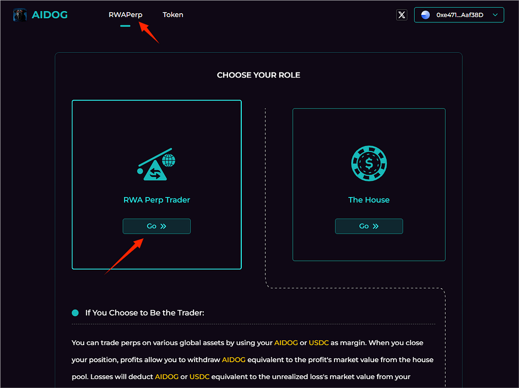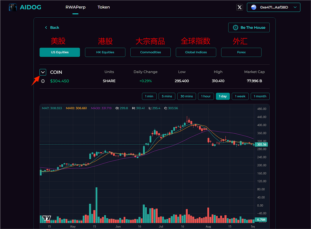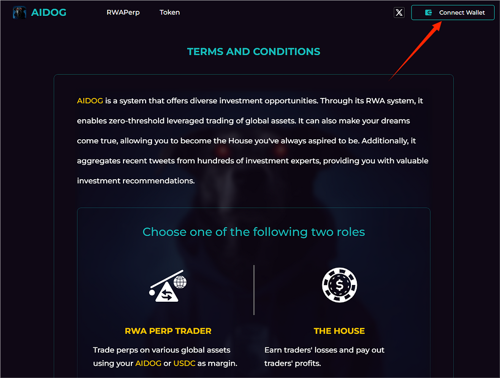 今天我们开始体验大家最想知道的RWA内容。AIDOG起初是一个推特上的AI机器人,可以预测币的走势,找到好的投资标的,之后发了币并且做成了一个RWA的投资网站,通过使用预言机,通过价差合约使得我们可以购买全世界热门的投资品。