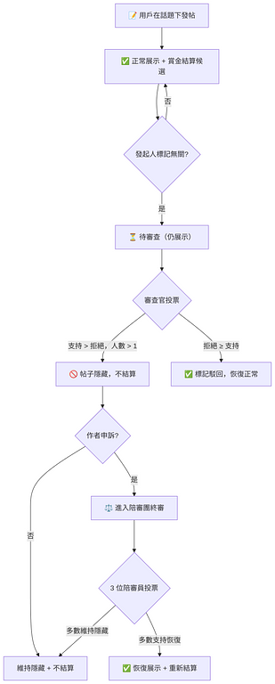 • 多數支持恢復 → 帖子恢復展示,重新進入賞金結算