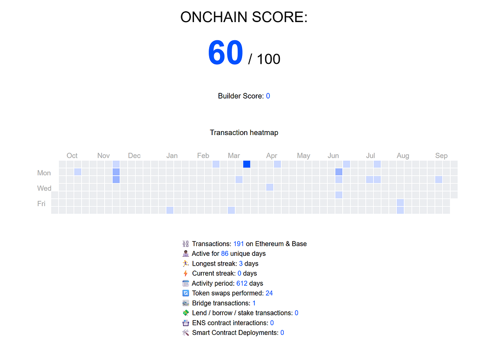 - 冲击: 这是一个核心指标,占分数的最大部分。例如,一个在 Base 上拥有 300 个交易(交换、转账)的钱包可以达到 ~70/100 的该指标。