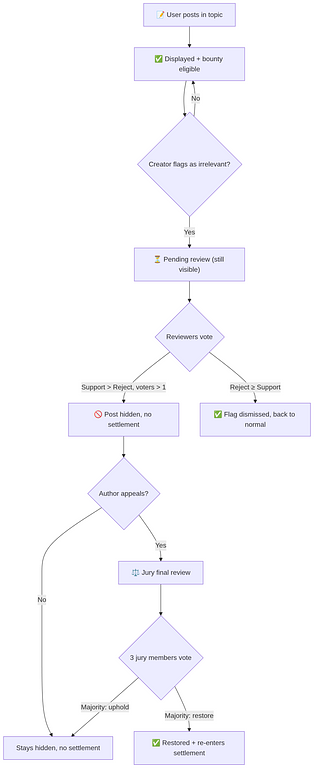 Community proposal: Introduce a decentralized moderation system with Reviewers and Jury to handle off-topic posts in bounty topics. Creators flag, reviewers vote, authors can appeal to a jury. Rewards are tied to outcome consistency. No single party holds absolute power.