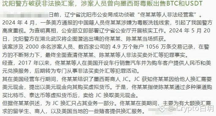 我是白玥!刚刚看到沈阳警方那个案子,我后背发凉,佟某某向墨西哥毒贩卖BTC和USDT,2000多人、4.9万个账户、1056万条交易记录全被扒光!这不是故事,这是币圈真实上演的“无间道”。你敢信?从2017年到现在,每一笔非法换汇都在监管眼皮底下裸奔!