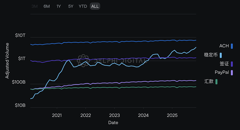 经月度调整的稳定币交易量已超越PayPal和Visa的年初至今交易额