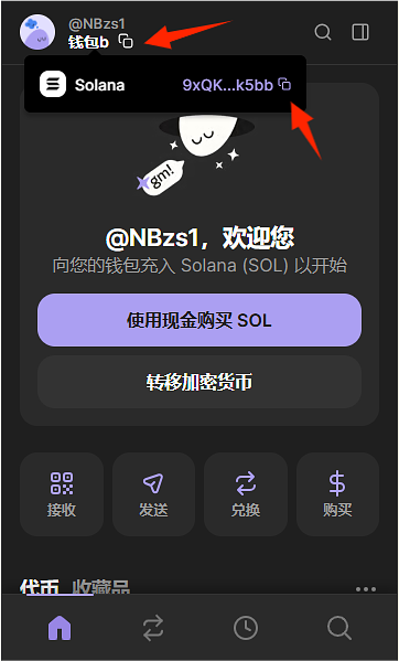 复制我们SOL的地址,我们可以比对这个地址与我们OKX钱包地址相同。