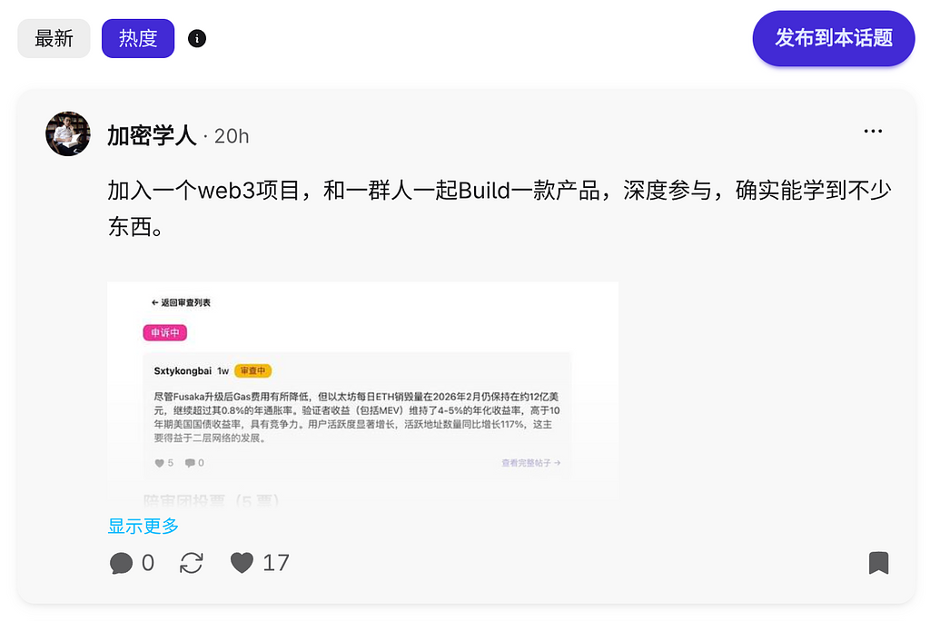 話題頁有了審查入口。 進入話題後,如有進行中的審查,頂部會出現醒目提示橫幅;沒有活躍審查時也有低調的審查歷史連結,方便查看。