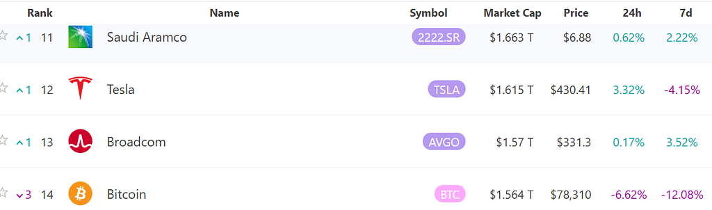 比特币遭特斯拉反超,全球资产市值排名降至第14位