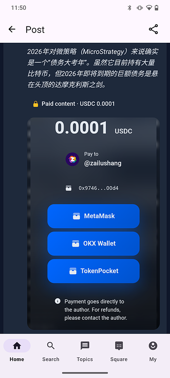 新增 OKX 和 #TokenPocket 支付。OKX 指 OKX 交易所综合 App(内置 Web3 钱包),非独立的 #OKX Wallet App。与 MetaMask 一起,手机用户可通过三款主流钱包一键唤起,完成 USDC 支付解锁付费内容。